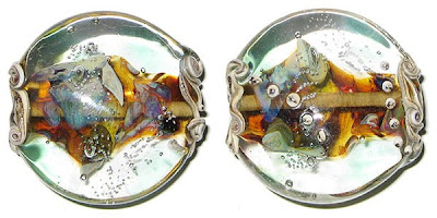 Next up is a core of Light Brown Transparent, rolled in Striking Color frit, encased in Clear. Then it was wrapped with fine silver mesh and encased again, this time with both Clear and Pale Emerald and decorated at the ends with SiS. I think this is my favourite bead from last weekend, but I'm a little bothered by how stiff and lifeless the dots are in the right-hand image. I am awful at surface decoration. My next class needs to be about surface decoration techniques.